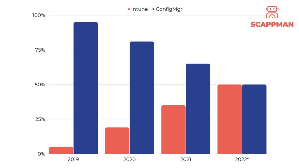 Intune is a cloud-based mobile device management and mobile application management service from Microsoft. The majority of companies are using SCCM for managing their mobile devices, but everything is changing. Based on Microsoft data, the percentage of the Windows devices managed by Intune is constantly growing. And by the end of 2022, Microsoft is forecasting that 50 per cent of Windows 10 devices will be managed from the Cloud.